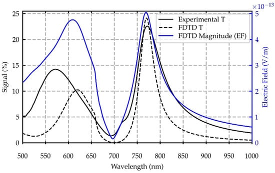for x-normal and y-normal planes centered in the origin of the FDTD box coordinate system, and a z-normal monitor placed in correspondence with the air/PMMA/gold line of contact. By integrating Equation (1) in space, the EF magnitude spectral profile at the gold/PMMA/air interface was calculated. The EF spectral profile and the experimental T spectrum, displaying both the narrower structure centered at 770 nm and the broader one at shorter wavelengths, provide consistent validation of the structural model and give a sufficiently accurate description of the real system for the purpose of the present study.