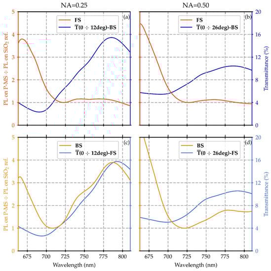 Comparison between the ratio of the normalized photoluminescence spectra of ATTO700 measured on the plasmonic metasurface (P-MS) and on the SiO2 reference with the transmittance signals averaged over the angles lying within the NA value. The first row refers to the positioning of the detector at the front side (FS) for NA = 0.25 (a) and NA = 0.50 (b). In the second row, the positioning of the detector is at the back side (BS) of the structure for NA = 0.25 (c) and NA = 0.50 (d).