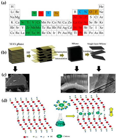 (a) Different MAX-phase atoms, (b) Top-down synthesis steps of MXene nanosheets from the parent MAX-phase, (c) Electron microscope images before and after etching, and exfoliated MXene, reprinted with permission from [28], (d) Ions intercalation and delamination in Ti3C2Tx layers, reprinted with permission from [29].