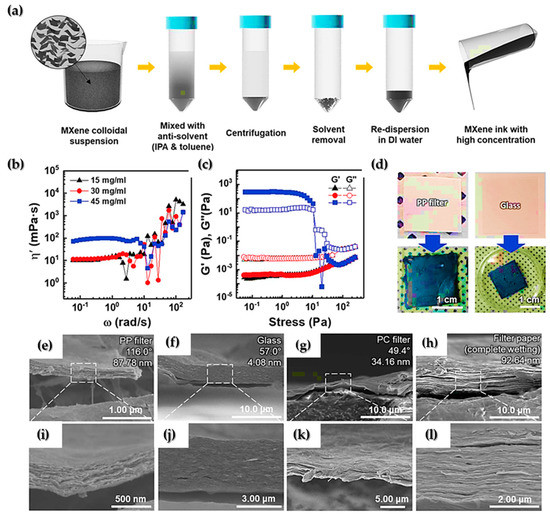 (a) Schematic illustration of the fabrication process of MXene ink. (b) Dynamic shear viscosity (ɳ’) curves of MXene inks at various concentrations and (c) the storage (G′) and loss (G″) moduli curves of MXene inks as a function of shear stress at different flake concentrations. (d) Painted MXene ink on various substrates using a brush. SEM cross−sectional images of painted MXene ink on the (e,i) PP filter, (f,j) glass, (g,k) PC filter, and (h,l) filter paper. Detailed information (i.e., contact angle and root−mean−square surface roughness) on the bare substrates is included on the upper right in (e–h), reprinted with permission from [62].