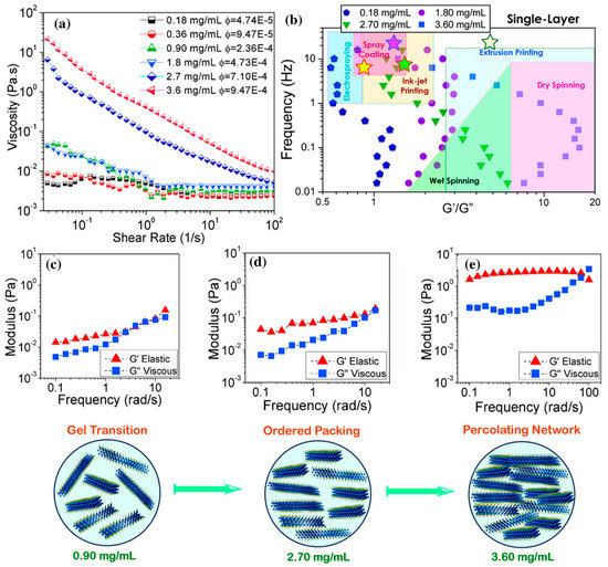 Viscoelastic response of 0.18–3.60 mg mL−1 (volume fraction, ϕ, 4.74 × 10–5–9.47 × 10–4) mono-layer Ti3C2Tx MXene in water. (a) Shear rate against viscosity (b) Frequency verses G′/G″ in different fabrication techniques. The stars show the approximate parameters used in MXene applications obtained from the literature. The viscoelastic behavior of MXene suspensions having (c) 0.9 mg mL−1, (d) 2.7 mg mL−1, and (e) 3.6 mg mL−1 MXene loadings under 0.1% strain amplitude, reprinted with permission from [87].