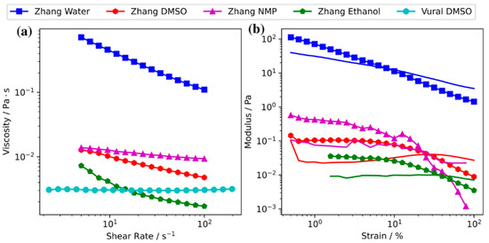 Comparison of rheological behavior of Ti3C2Tx MXene-based inks reported by Zhang et al. and Vural et al. (a) Viscosity vs. shear rate. (b) Loss and elastic moduli vs. oscillatory strain amplitude (G″ without markers and G′ with markers). The amounts of Ti3C2Tx MXene in water, ethanol and NMP are respectively 36, 0.7, and 12 mg mL−1. 12 mg mL−1 and 2.25 mg mL−1 are the Ti3C2Tx concentrations in DMSO, respectively, used by Zhang et al. and Vural et al.