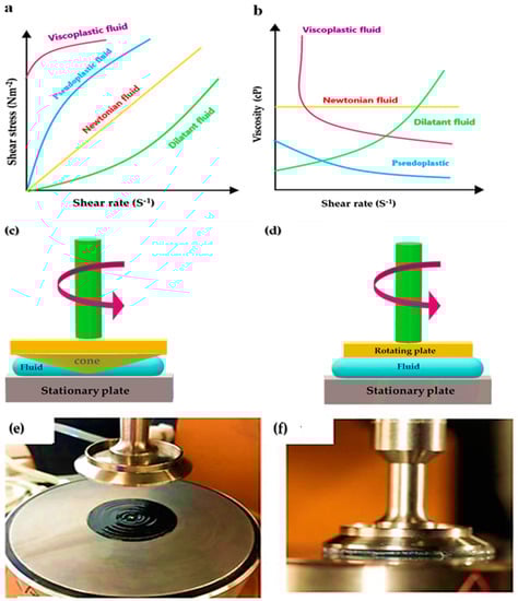 (a) Shear stress and shear strain flow curves for different fluids and (b) viscosity profiles for different fluid systems (c) Schematics (not to scale) of CTP and (d) PTP viscometers. Photograph of a PTP setup preparing for measurement with (e) plate retracted and ink loaded and (f) plate down on an ink sample, reprinted with permission from [44].