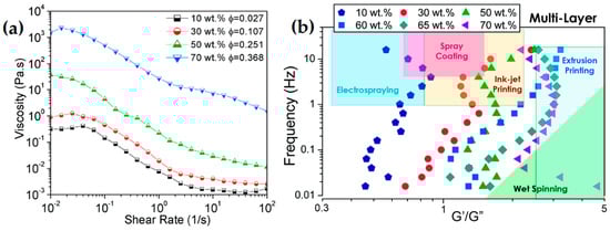 According to Akuzum et al. [87], G′ is frequency dependent in higher weight fraction of MXenes (i.e., G′ ≈ 2 Pa at 3.60 mg mL−1), being a suitable condition for those processes with weak gel-like wet spinning (Figure 4). Depending on weight fraction, viscosity, and elastic and loss modulus, Ti3C2Tx can be used in a variety of techniques, such as spray coating, wet spinning, and inkjet printing, among others.