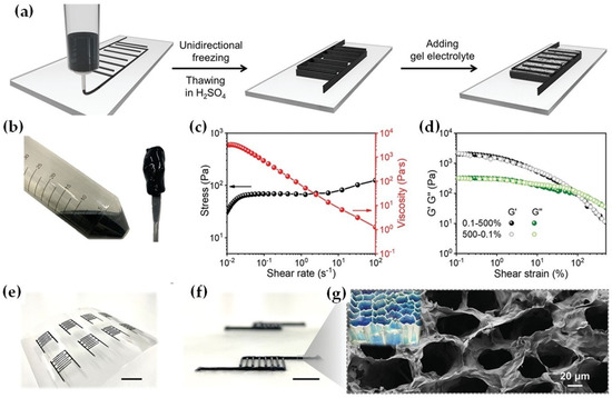 Using a low-waste layer-by-layer extrusion printing technique, Yang et al. [90] could produce 3D freestanding MXene architectures with an ideal rheological property to be used in microsupercapacitors wherein the energy and power densities of 24.4 μWh cm−2 and 0.64 mW cm−2 were respectively achieved at 4.3 mA cm−2; it was seen an increase in the weight fraction of Ti3C2Tx MXene might greatly increase the viscosity and elasticity of the given ink system exhibiting the shear thinning of four orders of magnitudes and a quick transition from low (0.01 s−1) to high (1000 s−1) shear rates when 50 mg mL−1 Ti3C2Tx (with G′LVR of 36.5 kPa and oscillatory stress value of 206 Pa) is used being promising for the DIW.