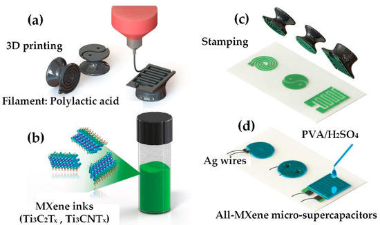 - Orangi, J.; Hamade, F.; Davis, V.A.; Beidaghi, M. 3D printing of additive-free 2D Ti3C2Tx (MXene) ink for fabrication of micro-supercapacitors with ultra-high energy densities. ACS Nano 2019, 14, 640–650. [Google Scholar] [CrossRef] [PubMed]