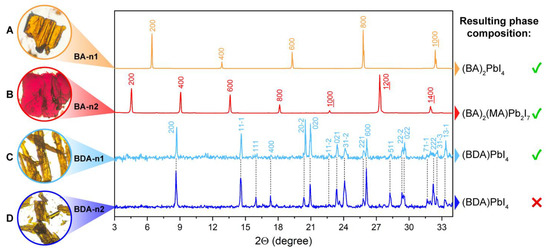 Optical photographs of single crystals, synthesized from solutions relevant to (BA)2PbI4 (A), (BA)2(MA)Pb2I7 (B), (BDA)PbI4 (C), (BDA)(MA)Pb2I7; (D) perovskite compositions and corresponding powder XRD patterns. On the right, the actual phase composition of each sample is given, indicating the failure to obtain the (BDA)(MA)Pb2I7 compound.
