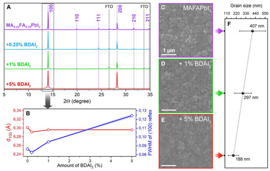 (A) XRD patterns of MA0.25FA0.75PbI3 perovskite films with a different amount of BDAI2 additive. (B) Interplanar distance (red) and FWHM (blue) of (100) perovskite reflex as a function of BDAI2 amount. (C–E) Top-view SEM images of MAFAPI perovskite films without additive (C), with 1% BDAI2 (D), and with 5% BDAI2 (E). The scale bars are 1 µm. (F) Average grain size of corresponding perovskite films with different BDAI2 contents.