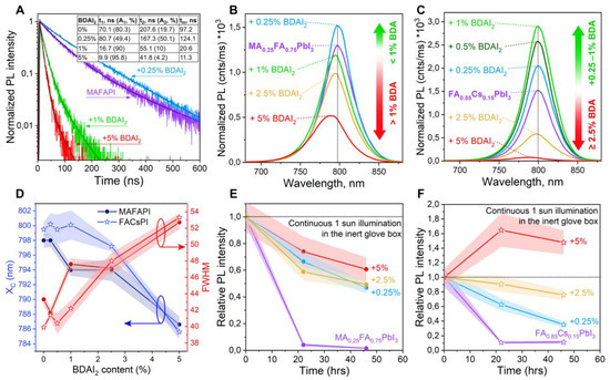 (A) Time-resolved PL decay curves of MA0.25FA0.75PbI3 + x% BDAI2 films. Estimated charge carrier lifetimes (t1 and t2 with corresponding relative amplitudes A1 and A2, and average lifetime tm) are given in the inset table in (A). (B,C) Steady-state PL spectra of MA0.25FA0.75PbI3 + x% BDAI2 (B) and FA0.85Cs0.15PbI3 + x% BDAI2 (C) films. (D) Graphical illustration of PL peak positions (XC) and widths (FWHM) as a function of BDAI2 content for both MAFAPI (–●–) and FACsPI (–✩–) samples. (E,F) Photostability of MAFAPI (E) and FACsPI (F) films with different BDAI2 contents as an evolution of PL intensity, under continuous 1 sun irradiation in inert glove box.