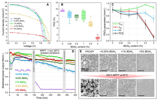 (A) Quasi-steady-state J–V curves of record FA0.85Cs0.15PbI3-based devices with 0.25, 1, 2.5, and 5% BDAI2 additive. (B) Distribution of absolute PCE values of FA0.85Cs0.15PbI3-based PSCs with a different BDAI2 content. (C) The dependence of FF, VOC, JSC, and PCE parameters as a function of BDAI2 content. Each parameter is normalized by the corresponding average value of the reference devices. (D) Normalized values of stabilized power output (SPO) of encapsulated devices with a different BDAI2 amount. Vertical grey regions illustrate the technical interruptions in signal registration. During this time, light soaking and heating did not stop; the devices were loaded at a voltage near the MPP conditions. (E) SEM images of FACsPI + x% BDAI2 perovskite surface in PSCs before (top row) and after 400 h of MPPT at 65 °C (bottom row). All scale bars correspond to 500 nm.