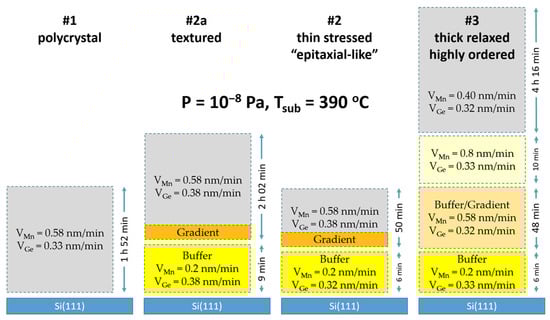 To determine the conditions for the epitaxial growth of Mn5Ge3 on the Si(111) surface, a series of experiments were performed. Here we show three processes differing in the rate, ratio and time of Mn and Ge deposition during the growth of the buffer layers. These examples demonstrate the effect of buffer layers on the growth processes, structure and morphology of Mn5Ge3 thin films. Schematic diagram of process flow is shown on Figure 1. Sample #1 was synthesized as a single layer at a fixed deposition rate of Mn VMn = 0.58 nm/min and Ge VGe = 0.33 nm/min. During the growth of the first 15 nm, the RHEED pattern transforms from point reflections to streaks and then turns into Debye rings, indicating the formation of a polycrystal (Figure 2a). For sample #2a, one approximately 3 nm thick buffer layer with a low concentration of Mn was grown (VMn = 0.2 nm/min and VGe = 0.33 nm/min).