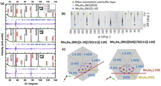 Similar XRD patterns are observed for all samples. The diffraction peaks are in good agreement with those for the Mn5Ge3 with P6₃/mcm space group crystal. The lattice parameters presented in Table 1 were determined via Pawley refinement with the help of GSAS-II software []. Silicon diffraction peaks were used for correction of line shift and afterwards excluded from the refinement procedure. Analysis shows that lattice parameters a (7.112(1) Å) and c (5.027(1) Å) are close to the bulk values. It should be noted that the parameters of sample #3 correspond most accurately to the reference lattice parameters. In addition, the intensity of reflection with index (006) at 133.5 degrees on the X-ray pattern increases from sample to sample and reaches a maximum at #3, which indicates good crystalline quality and high texture on the Mn5Ge3(001) plane. Consequently, sample #3 was selected for further detailed studies. Figure 3b shows a phi-scan, in which reflections can be interpreted assuming two predominant azimuthal orientations in the (001) plane of Mn5Ge3 relative to Si(111), as well as a signal from the buffer layer and other differently orientated crystallites of Mn5Ge3, i.e., (100) texture. The formation of a negligible amount of side orientation is explained by a temperature gradient over 40 × 40 mm substrate. This indicates a high texture on the (001) Mn5Ge3 plane and only two crystallite orientations. Figure 3c schematically shows the crystal cells of Mn5Ge3 and marks the two orientation relationships derived from the phi-scan.