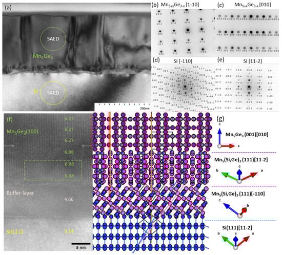 TEM and SAED patterns for sample #3. (a) Cross-sectional TEM image of Mn5Ge3/Si structure. (b–e) Electron diffraction pattern of Mn5Ge3 and Si in different crystallographic directions. (f) High-resolution TEM near the interface Mn5Ge3/Si. Numbers are distances between atomic planes in the arb. units extracted from the image by fast Furrier transform analysis. (g) Structural model of the Mn5Ge3 growth with two buffer layers of different orientations and levels of Si substitution of Ge sites.