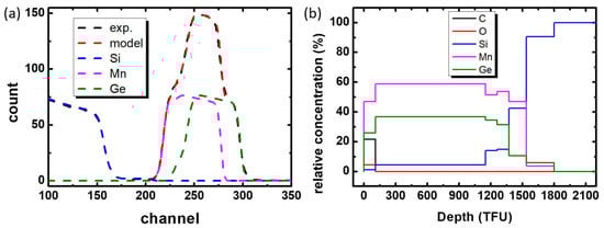 For a more detailed analysis of the composition of the layers, RBS studies were carried out. Experimental and model RBS spectra are presented in Figure 5a. The sum of simulated individual spectra of Ge, Mn and Si has good agreement with experimental data. The calculated depth profile is shown in Figure 5b. On the surface, we can see some oxidation and carbon contamination. Manganese germanide lies deeper with stoichiometry close to Mn5Ge3 slightly doped by silicon. Then, the content of manganese and germanium decreases, but the content of silicon increases. This is the transition layer that we are trying to implement in the growing process. However, silicon diffusion additionally occurred in the experiment. It is likely that the area marked with a rectangle in Figure 4f corresponds to a composition of approximately Mn5Ge1.5Si1.5. From here, the decrease in the interplanar distance indicated in Figure 4f becomes clear. Silicon, having a smaller ionic radius than germanium, reduces the volume of the crystal cell. The lowest layer contains up to 90% silicon. Thus, we can conclude that the buffer layer takes on almost all of the silicon diffusing from the substrate, preventing its incorporation into the main Mn5Ge3 layer.