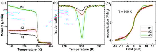 (a) Non-normalized magnetization temperature dependencies. (b) First derivative of magnetization temperature dependencies. (c) Normalized hysteresis loops measured at 100 K for Mn5Ge3 samples #1, #2 and #3.
