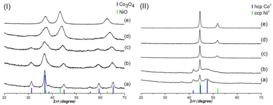 XRD patterns of obtained Co-Ni-containing systems after calcination (I) and reduction (II): Co_W8 (a); Co2Ni1_W8 (b); Co1Ni1_W8 (c); Co1Ni2_W8 (d); Ni_W8 (e).
