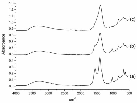 ATR FTIR spectra of the SAS-precipitated precursors of Co2Ni1 samples obtained with different water content: Co2Ni1_W0 (a); Co2Ni1_W4 (b); Co2Ni1_W8 (c).