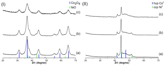XRD patterns of Co2Ni1 samples obtained with different water content after calcination (I) and reduction (II): Co2Ni1_W0 (a); Co2Ni1_W4 (b); Co2Ni1_W8 (c).