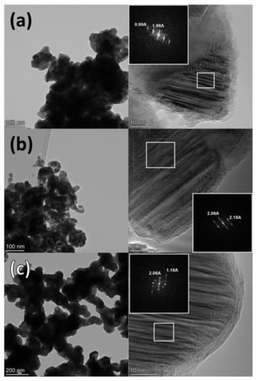 HR-TEM photographs and FFT patterns of the reduced samples: Co2Ni1_W8 (a); Co_W8 (b); Co2Ni1_W0 (c).
