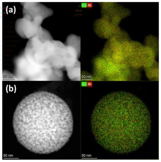 In the Co2Ni1_W8 sample, in addition to interlinked agglomerates with a branched morphology that are characteristic for the Co2Ni1_W0 sample (see Figure 5a), isolated spherical agglomerates of metal particles with a diameter of about 200 nm are also observed (see Figure 5b). According to the elemental mapping data, Co and Ni atoms are uniformly distributed over the volume of the agglomerates, and these samples have no phase separation into Co- and Ni-enriched regions. This means that, despite the presence of both the hcp and ccp phases in the Co2Ni1_W0 sample, these phases have the same elemental composition, indicating the formation of two solid solutions. It should also be noted that the elemental composition of the samples, according to EDX data, is close to the theoretical loads at the synthesis stage (Figure S2).