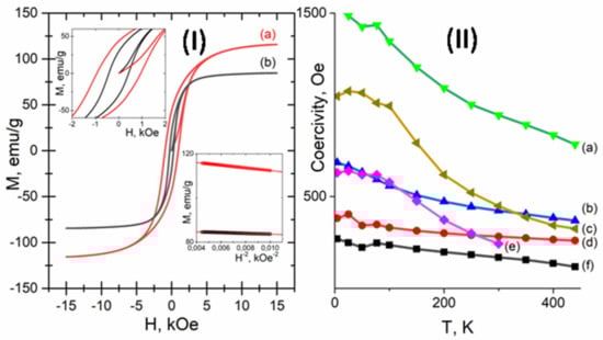 M(H) hysteresis loops at 300 K for the reduced samples (left insertion, M(H) near the origin; right insertion, high-field magnetization behavior in 1/H2 coordinates with linear regression): Co2Ni1 (a); Co1Ni2 (b) (I). Temperature dependencies of coercivity (HC(T)) for the samples: Co2Ni1_W8 (a); Co1Ni1_W8 (b); Co_W8 (c); Co1Ni2_W8 (d); Co_AC (e); Ni_W8 (f) (II).