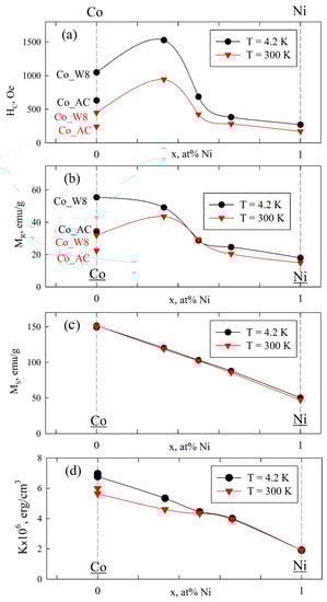Concentration (x in Co1−xNix) dependencies for coercivity (HC) (a), remanent magnetization (MR) (b), saturation magnetization (MS) (c), and magnetic anisotropy constant (K) (d) for the studied series of samples at 4.2 and 300 K. Solid curves are visual guides. In (a,b), data for Co_AC and Co_W8 are marked in the graphs. In (d), data for Co_AC are shown without “guide lines”.