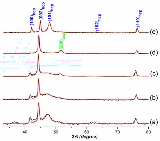 Experimental XRD patterns (black curves) and calculated XRD profiles (red curves) of the samples: Co_W8 (a); Co2Ni1_W8 (b); Co2Ni1_W0 (c); Co1Ni1_W8 (d); Co_AC (e).