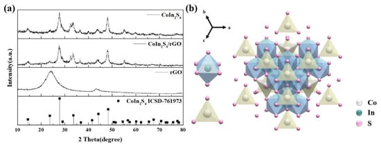 (a) XRD patterns of CoIn2S4, CoIn2S4/rGO, and rGO samples; (b) crystal structure of CoIn2S4.