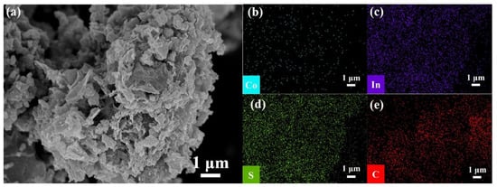 SEM and HRTEM were used to examine the surface morphologies of the as-prepared samples. As depicted in Figure 2a,b, the as-synthesized CoIn2S4 exhibited an irregular morphology, a relatively smooth surface, and inhomogeneous diameters of about 1–2 μm. The EDS mapping of CoIn2S4 is shown in Figure 2c. The computed molar concentrations of Co, In, and S in CoIn2S4 were 6.70, 29.59, and 63.71%, respectively.