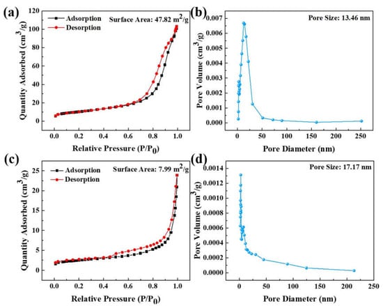 Figure 5a,c depicts the specific surface area of pristine CoIn2S4 and CoIn2S4/rGO composites. The specific surface areas of CoIn2S4 and CoIn2S4/rGO composites were 47.82 and 7.99 m2/g, respectively. After adding rGO, the surface area of CoIn2S4 decreased, indicating that rGO completely encapsulated the CoIn2S4 samples. The BJH method was used to calculate the pore size distributions of pristine CoIn2S4 and the CoIn2S4/rGO composite, as shown in Figure 5b,d. CoIn2S4 and CoIn2S4/rGO had BJH desorption average pore diameters of 13.46 and 17.17 nm, respectively.