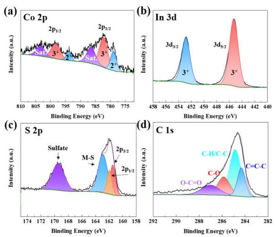 The XPS spectra of (a) Co 2p, (b) In 3d, (c) S 2p, and (d) C 1s for the CoIn2S4/rGO composite.