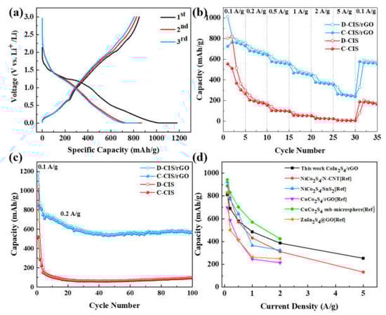 The charge/discharge profiles of the as-synthesized CoIn2S4/rGO electrode at 0.1 A/g for the first three cycles are depicted in Figure 7a. In the first cycle, the charge and discharge capacities of CoIn2S4/rGO were 1180 and 850 mAh/g, respectively. At the beginning of the cycle, the coulombic efficiency was 72%. However, the charge and discharge capacities of CoIn2S4/rGO were 838 and 805 mAh/g with a 96% coulombic efficiency after three cycles. The irreversible capacity fading is attributable to the irreversible decomposition of the liquid electrolyte during charging, forming an SEI layer. Figure 7b depicts the rate capability tests of pristine CoIn2S4 and CoIn2S4/rGO electrodes with varying current densities. The charge capacities of the CoIn2S4/rGO electrode were 781, 680, 574, 478, 277, and 265 mAh/g at current densities of 0.1, 0.2, 0.5, 1, 2, and 5 A/g, respectively. When the current density was switched back to 0.1 A/g, the reversible capacity of CoIn2S4/rGO was 563 mAh/g. Figure 7c depicts the cycle performance of bare CoIn2S4 and CoIn2S4/rGO composites. The initial current density used for electrode formation was 0.1A/g. Between the fourth and hundredth cycles, the current density decreased to 0.2 A/g. After 100 cycles, the pristine CoIn2S4 exhibited a capacity of 84 mAh/g. The rGO matrix buffered the dramatic volume expansion of CoIn2S4 during the lithiation and de-lithiation processes, resulting in a higher reversible capacity of 670 mAh/g for the CoIn2S4/rGO electrode.