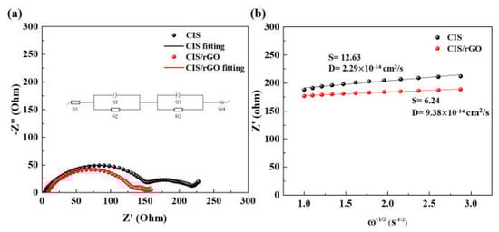 (a) Nyquist plots of pristine CoIn2S4 and as-synthesized CoIn2S4/rGO composite after 2.5 cycles; (b) relation between Z’ and ω−1/2 for CoIn2S4 and CoIn2S4/rGO electrode at low frequencies.