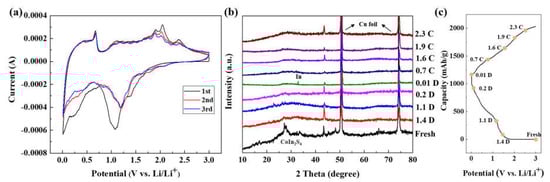(a) CV curves of CoIn2S4/rGO at a scan rate of 0.1 mV/s in the first three cycles; (b) ex situ XRD measurements of as-synthesized CoIn2S4/rGO electrodes after different charge and discharge states; (c) the corresponding discharge/charge profile of CoIn2S4/rGO electrodes of potential indication at the 1st cycle.