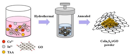 The Hummers’ technique was adapted to synthesize GO [31]. CoIn2S4/rGO was prepared via a simple hydrothermal process. Initially, GO powder was ultrasonically dispersed in 50 mL of deionized (DI) water for 30 min. Subsequently, 1 mmol of Co(NO3)2·6H2O (Cobalt(II) nitrate, 98%, SHOWA), 2 mmol of In(NO3)3 (Indium nitrate, 99.99%, Alfa Aesar, MA, USA), and 8 mmol of CH3CSNH2 (Thioacetamide, 99%, Alfa Aesar, Haverhill) were added to the above solution and stirred for 2 h. Then 15 mmol of CH4N2O (Urea, 99%, Sigma Aldrich, St. Louis, MO, USA) was added dropwise. After vigorously stirring the mixture for 1 h, it was placed in a 100 mL Teflon-lined stainless steel autoclave and heated at 180 °C for 24 h. The CoIn2S4 powder was obtained by high-speed centrifugation and multiple washes with DI water and ethanol at room temperature before natural cooling. The samples were then vacuum-dried at 70 °C for 12 h. In contrast, pristine CoIn2S4 was synthesized via a similar procedure, excluding the addition of GO to the mixture solution (Scheme 1).