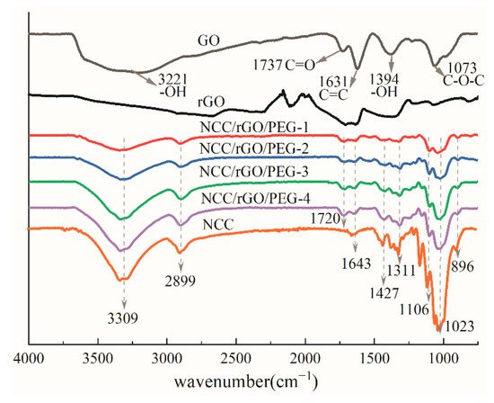 Figure 3 shows FTIR spectra of the GO, NCC, and NCC/rGO/PEG composite films. The GO films exhibited obvious characteristic peaks of oxygen-containing groups: stretching vibration (–OH) at 3221 cm−1, stretching vibration at 1737 cm−1, in-plane bending vibration (–OH) at 1394 cm−1, and vibrational absorption (C–O–C) at 1073 cm−1. In addition, the characteristic peak at 1631 cm−1 corresponds to the carbon-carbon skeleton of GO (C=C). These functional groups demonstrate the preparation of GO. The infrared spectrogram of NCC exhibited a strong absorption peak at 3309 cm−1, which corresponds to the telescopic vibrational absorption of the hydroxyl group (–OH); the telescopic and bending vibrational peaks of C–H were evident at 2899 and 1427 cm−1. A weak absorption peak was at 1643 cm−1, corresponding to the stretching vibration of C=C. The peak at 1311 cm−1 corresponds to the bending vibration of –OH. The peaks at 1023 and 1106 cm−1 correspond to the C–O–C stretching vibration of cellulosic alcohol and the stretching vibration of the C–C backbone, respectively. The 896 cm−1 –OH stretching vibration absorption peak is characteristic of the β-glycosidic bond between cellulose-dehydrated glucose units [32]. Thus, the chemical structure of NCC prepared with concentrated sulfuric acid was not disrupted and retained the basic chemical structure of cellulose [33].