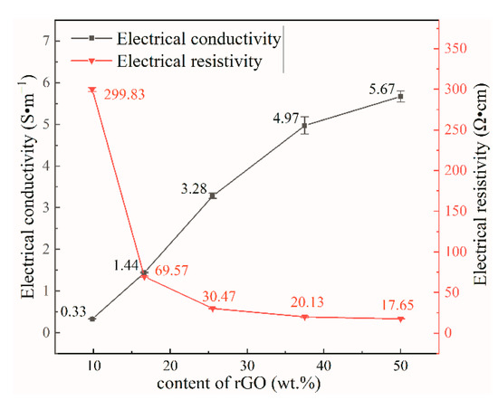 After reducing GO, the rate of electron transfer is affected because of factors such as incomplete removal of oxygen-containing functional groups and incomplete recovery of the structural lattice defects generated during the oxidation [44]. Therefore, rGO does not exhibit an EC as high as that of graphene, graphene conductivity is 1 × 106 S·m−1, and the rGO film conductivity measured in this experiment is only 15.51 S·m−1 (6.45 Ω·cm). The electrical resistivity (ER) of the samples were tested with a four-probe resistivity tester (Figure 7), the ER of the composites increased rapidly with decreasing rGO content. The thickest composite film prepared in this study was 26 μm and the thinnest was 21 μm; the effect caused by the small thickness difference was negligible. Figure 7 shows the calculated electrical conductivity of the samples. The EC increased gradually with increasing rGO content. Because of the many hydroxyl groups of NCC (which form intermolecular hydrogen bonds when blended with graphene in a manner that facilitates uniform intercalation into the middle of the graphene lamellae, and prevents graphene from π–π self-stacking), a more complete conductive network tends to form in the composite film with increasing graphene content [45].