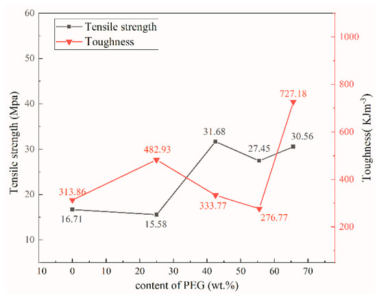 Tensile strength of the samples were tested in accordance with GB/T 1040.3-2006 [59] executive standard. The toughness (Figure 8) was derived from the area integral enclosed by the stress–strain curve. The tensile strength of rGO/NCC was 16.71 MPa and the toughness was 313.86 kJ·m−3. After adding a small quantity of PEG, the tensile strength of the composite film decreased slightly, but the toughness increased to 482.93 kJ·m−3; which is because adding PEG decreased the number of hydrogen bonds between the NCC polymer chains and thus improved the stability of the film matrix [60]. With increasing PEG content the tensile strength continued to increase, but the toughness of the composite film slowly decreased because the increasing PEG content partially disrupted the original tight stacking of the lamellae in the composite film. PEG attaches to part of the NCC–rGO sheet layer and interacts with it, limiting the movement of the polymer molecular chains [61]. This is also consistent with the SEM and XRD results. When the PEG content was increased to 65.6 wt%, the tensile strength was 30.56 MPa, which is ca. 2.2× than the tensile strength (13.62 MPa) of the nanocellulose–graphene conductive film prepared with poly(lactic acid) by Liu [62]. Furthermore, the toughness of this sample reached a maximum of 727.18 kJ·m−3. Table 3 shows the tensile strengths of nanocellulose-based composite films in recent years, all of which are less than 31.68 MPa for NCC/rGO/PEG-2. Therefore, it indicates that the addition of PEG can improve the tensile strength of composite films. It can be seen from Figure 7 that the addition of PEG is also helpful to enhance the toughness of the composite film. Because a large quantity of PEG fills into the gap of the lamellae, adjacent lamellae are closely connected in a manner that is reminiscent of an adhesive filling the cracks, resulting in intermolecular forces that supplement the original weak bonding between PEG and NCC. At this time, the composite film contains more PEG with better ductility and water absorption compared with before adding PEG. Therefore, the mechanical properties of the composite film rGO/NCC/PEG-4 were optimal; the tensile strength of this sample was 1.83× higher than that of the rGO/NCC film without added PEG, and the toughness was 2.32× higher.