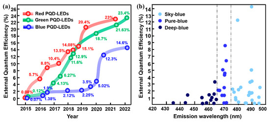 (a) Progress diagram of the EQEs for the reported PeQLEDs; (b) EQEs of the reported sky–, pure–, and deep–blue PeQLEDs.