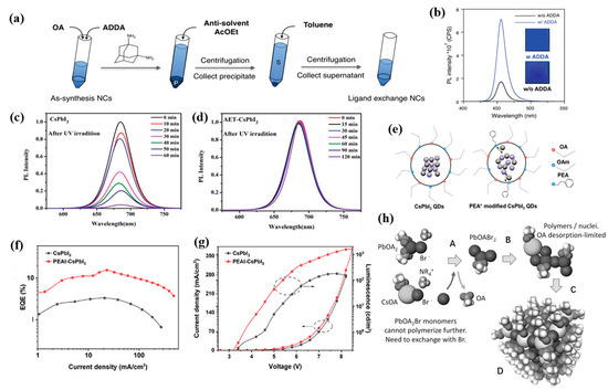 Tian’s group have reported a series of studies on ligand engineering for PQDs. As shown in Figure 4c,d, partially replacing OA and OAm with 2–aminoethanethiol (AET) has enhanced stability and carrier mobility, and passivated the traps of PQDs [85]. They also proposed a hydrogen bromide etching–driven ligand exchange strategy, in which didodecylamine and phenethylamine were introduced as short ligands to achieve stable and pure–blue–emitting CsPbBr3 PeQLEDs with a high luminance of 3850 cd/m2 [41]. Recently, they employed shorter phenethylammonium (PEA+) conjugated ligands to partially replace OAm at the surface of CsPbI3 QDs (Figure 4e–g), which facilitated improved hole transport, more balanced charge injection, and low efficiency roll–off [86]. KI and NaI as inorganic metal ligands have been introduced into the mildly polar antisolvent during the PQDs purification process, which effectively reduced the surface traps and improved the stability of PQD films [87]. Chen et al. indicated that employing octanoic acid and octylamine as co–capping ligands could obtain more stable α–CsPbI3 PQDs with an enhanced charge transport rate [88]. Other ligand modification methods by introducing 2–hexyldecanoic (DA) [89], amino acids [90], conjugated alkylamine, 3–phenly–2–propen–1–amine (PPA) [91], di–dodecyl dimethyl ammonium halide (DDAX, X = Br/Cl) [25,26,92], sulfobetaine [93] and phosphocholine [94], L–phenylalanine (L–PHE) [95], and propane–1,3–diammonium bromide (PDAB) [96] were also studied. In addition, it was revealed that the proton transfer between OA and OAm could lead to facile ligand loss and poor stability, as shown in Figure 4h, and an OA ligand–only synthetic method was consequently proposed using quaternary alkylammonium halides as precursors [21]. In particular, Cheng et al. in situ synthesized ligand–free PQDs into polyacrylonitrile nanofiber films, achieving a high PLQY of 71% and tunable emissive peaks (448–600 nm) [97].