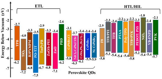 Energy diagram of the commonly used ETL, PQD, HTL/HIL materials in blue PQD–based LEDs.