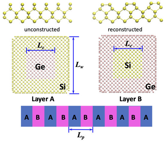We started with a normal Si NW with a diamond lattice along the [100] direction with a squared cross-section, the width of which was fixed as nm. Each layer of the SL was composed of a Si-Ge core-shell structure, as shown in Figure 1. Among the two primary stacking layers in SLs, one was composed of a Ge-core/Si-shell while the other one corresponded to a Si-core/Ge-shell with the same size. We denote the size of the core as . The alternative stacking of the two primary layers (ABAB) formed a CSSL. When or , the structure corresponds to a conventional Si/Ge SL. The period length is the total thickness of layers A and B (Figure 1). TCs are calculated for systems with different and . It is worth noting that Si and Ge have slightly different lattice parameters (5.43 Å for Si and 5.64 Å for Ge). In real cases, there should be a lattice mismatch at Si/Ge interfaces. However, we will need to build up a huge simulation box to compromise the two lattices if the lattice mismatch is considered, which will increase the simulation load dramatically. On the other hand, considering the lattice mismatch at interfaces will mean that we are not able to investigate the lateral interfaces. This is because at short SL period lengths, it is not possible to build a mismatched lateral interface. As a result, we follow the strategy in most of SiGe SL simulations in the literature [16,18,24] by setting up coherent interfaces, i.e., interfaces without lattice mismatch. We use an averaged lattice parameter of Si and Ge for SLs. In such a consideration, small stress exists at the interfaces. We terminated our NW surfaces with (100) facets, which have been widely adopted for Si NW simulations [18,20]. During the simulations, the atoms on the surface of NWs would form new bonds to lower their energy, i.e., surface reconstruction. The full reconstruction of all surface atoms requires a long time for simulations. Therefore, to save the computational costs and avoid possible unreconstructed atoms, we manually introduced () type surface reconstructions, the structure of which is shown in Figure 1. The () reconstruction forms a series of dimers, decreasing the number of dangling bonds by a factor of two.