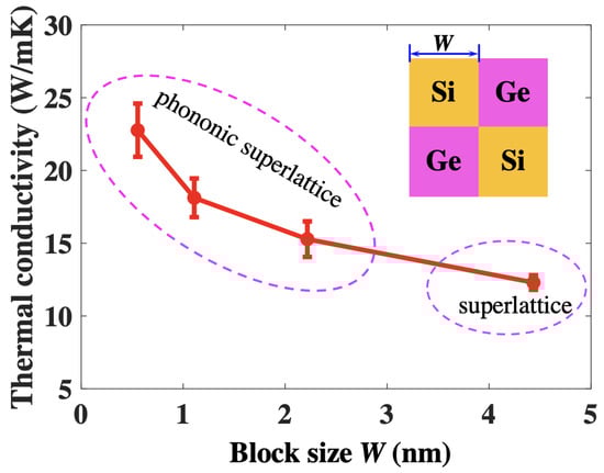 The ability to accurately control the thermal transport of material is fundamental in the development of heat dissipation and energy conversion applications [1]. For waste heat energy harvesting with thermoelectric modules, materials with low phonon thermal conductivity (TC) are essentially required to maximize efficiency [2,3,4]. Among different TC reduction strategies [1,5,6,7], constructing a superlattice (SL) with different materials has been regarded as a promising approach. In SLs, phonons can be extensively scattered by the numerous interfaces. It is well known that the TC of a SL is period length-dependent, and it varies non-monotonically with period length. A minimum thermal conductivity (TC) was usually observed at a certain critical period length (typically a few nanometers) [8,9,10,11,12,13,14,15,16,17,18,19,20]. Beyond the critical period length, phonon–interface scattering is dominant, and TC increases with an increased period length. In this region, phonons can be treated as particles, and the Boltzmann transport equations can be applied to predict the TC of a SL [21]. However, phonon transport becomes coherent when is below the critical value, and the TC increases with a decrease of . For SLs with short period lengths, the structure can be treated as a homogeneous material, and phonons will not feel the interface. With the decrease in period length, more and more phonons transport coherently, leading to an enhanced TC in SLs. The coherent phonon transport is a consequence of the wave effect, and the phonon particle assumption fails in this region. Coherent phonon transport has been widely observed in SLs with short period lengths [8,9,10,11,12,13,14,15,16,17].