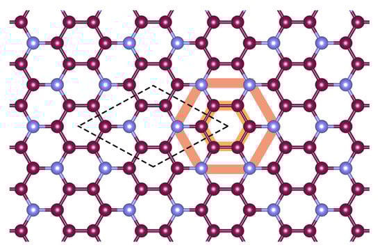 The band structure of monolayer N has been calculated before at the DFT level of theory [,,] and also using the GW approach [,,]. The main effect of the GW approach is to enhance the band gap, and this does not affect our main conclusions below. To be self-contained, we repeat the band structure calculations at the DFT level. The schematics of the crystal lattice of single-layer N is shown in Figure 1. The lattice of N possesses P6/mmm space group with a planar hexagonal lattice, and the unit cell contains six carbon and two nitrogen atoms. We used the Wien2K package [] to perform first-principles calculations based on density functional theory (DFT). For the exchange–correlation potential, we used the generalized gradient approximation []. The optimized input parameters, such as RKmax, lmax, and k-point, were selected to be , 10, and , respectively. The convergence accuracy of self-consistent calculations for the electron charge up to was chosen, and the forces acting on the atoms were optimized to dyn/a.u. The optimized lattice constant is , in good agreement with previous studies [,].