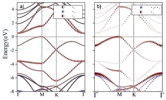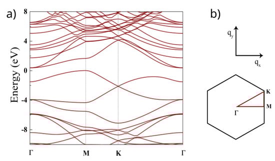 The calculated band structure is shown in Figure 2. The conduction band minimum is located at the point, while the valence band maximum can be found at the M of the BZ. Thus, at the DFT level, N is an indirect band gap semiconductor with a band gap of eV which is in good agreement with previous works [,]. We checked that the magnitude of the spin-orbit coupling is small at the band-edge points of interest and, therefore, in the following, we will neglect it. The main effect of spin-orbit coupling is to lift degeneracies at certain high-symmetry points and lines, e.g., the four-fold degeneracy of the conduction band at the point would be split into two, two-fold degenerate bands.