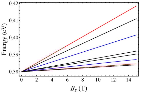 Landau levels in the CB at the point of the BZ as a function of the out-of-plane magnetic field . Blue lines show and , given below in Equation (15), and red lines indicate the first two LLs that can be obtained from the Ansatz in Equation (16). Black lines show the “conventional” LLs. See the manuscript.