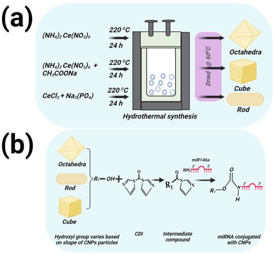 A schematic diagram for the miR146a conjugation with CNPs is shown in Figure 1b. A 30 μL aqueous solution of 1000 µg/mL octahedral, cubic, or rod-shaped CNPs were mixed with 270 µL of DMSO solution. A 30 µL solution of 500 mM CDI (1,1-carbonyldiimidazole) DMSO solution was then added. Next, the final solution was slightly agitated under room temperature for 1 h. A 50 µL solution of 200 µM miR146a aqueous solution was added into the activated CNPs solution. The resulting solution was gently shaken for 2–3 min by hand. Afterwards, a 3790 µL solution of 10 mM borate buffer, of pH of 8.5, was added followed by slight agitation under room temperature for 3 h. The resulting solution (2 mL) was transferred into the filter-insert part of each dialysis tube and was allowed to dialyze against RNAse/DNAse free water. It was then placed in an orbital shaker and continuously shaking at 150 RPM at room temperature. The water was replaced after 2 h and then left overnight. The miR conjugated CNPs sample was aliquoted and stored in a −20 °C until further use. The miR146a conjugated with CNOct, CNC, and CNR samples were named as CNOct-miR146a, CNC-miR146a and CNR-miR146a.