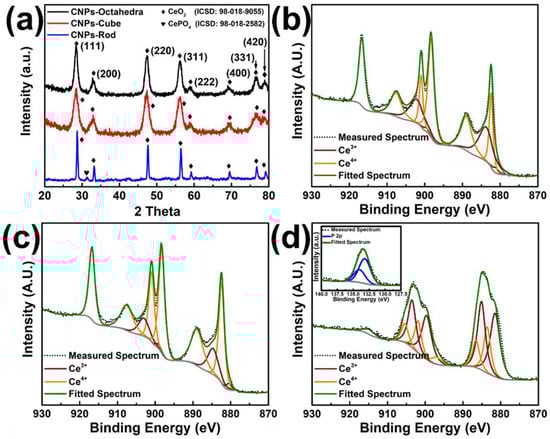 XRD and XPS of different shapes of CNPs were synthesized by the hydrothermal method. (a) shows the XRD patterns of CNPs-rod (bottom), CNPs-cube (middle), and CNPs-octahedra (top). The major peaks in the XRD for these nanoparticles correspond to the cubic structure of cerium oxide (ICSD: 98-018-9055) and the minor peak in the CNPs-rod XRD pattern corresponds to CePO4 (ICSD: 98-018-2582). This result suggested that the CeO2 structure has formed all conditions. Only, the CNR synthesis condition produces the CeO2 along with traces of the CePO4 phases. (b–d) shows the deconvoluted Ce3d binding region in the XPS spectrum of CNOct, CNC, and CNR, and (d)-insert shows the deconvoluted P2p region in CNR samples. The deconvoluted peaks are clearly distinguished according to their oxidation states of Ce3+ (shown in red color) and Ce4+ (shown in orange color) in the CeO2 structure. Spectrum representatives for each sample are unique from each other: highlighting the distinct surface character of each morphology (e.g., faceting and vacancy site presentation). The percent of reduced cerium sites, relative to total cerium sites, was observed to increase with increasing material aspect ratio (26.8, 16.1, and 66.6% for CNOct, CNC, and CNR, respectively).