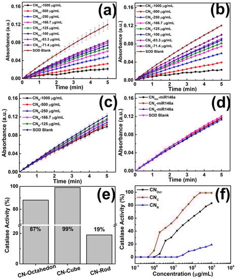 The calculated result of SOD and CAT activity are shown in Figure 4a–f: In SOD activity assay, the octahedra possesses the highest SOD activity 82.0%, followed by cube (77.2%) and rod (16.5%) at 1000 µg/mL concentration, in CAT activity assay, cube possesses the highest CAT activity 99%, followed by octahedra (87%) and rod (19%) at 1000 µg/mL (Figure 4a–d, Table 2). CAT (Figure 4e–f). (Note: Alternative comparison and discussion of the above SOD/CAT% assay results are carried out from a different perspective and provided in Supplementary Materials page 8–9, with Figure S6. The concept of “effective surface area” (SESA), which associates with mass concentration (M), was introduced, and used to evaluate the enzymatic activity of the nanoparticles. Besides, a brief discussion on why M was chosen as the controlled variable in below discussion is also provided in the in Supplementary Materials page 10.)