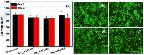 Cell viability and live/dead assay results of pure and miR146a conjugated octahedra, Cube, and rod CNPs samples. (a) shows the percentage of cell viability after 0.4 ng/µL of miR146a conjugated different shapes of CNPs-treated cells. Non-treated cells were considered as the control. In addition, the merged image of live and dead cells for control cells (nanoparticles non-treated cells), and 0.4 ng/µL of miR146a conjugated different shapes of CNPs were shown in (b–e). The scale bar is 100 µM.
